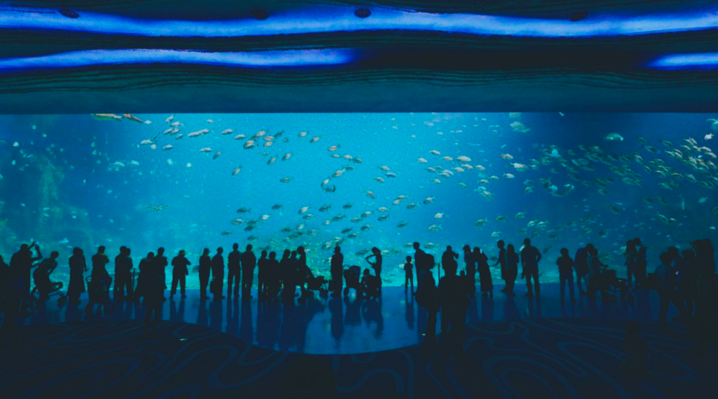 Walking down a dark glass corridor, lit up only by the blue light spilling in through a filter of fish and water. Either side of you, glass monoliths smudged by sweaty palms like your own. You look through the windows into the vastness of a huge tank, that darkens and fades the further in you stare. Suddenly you trip over and get a terrible sensation that you may fall into the endless water that surrounds you. But a firm hand holds your arm tight and you never reach the ground.